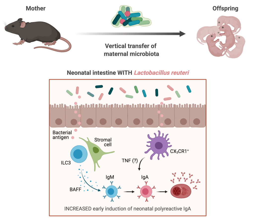 Infants are prone to enteric infections due to an underdeveloped immune system. Maternal microbiota, through shaping the neonatal microbiota, helps establish a strong immune system in infants. We and others have observed the phenomenon of enhanced early neonatal IgA production in pre-weaning immunocompetent mice nursed on immunodeficient dams. Here, we show that this enhancement of IgA in neonates results from maternally derived microbiota. In addition, we have found that the neonatal IgA production can be induced by Lactobacillus reuteri, which is enriched in the milk of immunodeficient dams. Moreover, we show that while the production of neonatal IgA is dependent on neonatal T cells, the immunodeficient maternal microbiota-mediated enhancement of neonatal IgA has a T cell-independent component. Indeed, this enhancement may be dependent on type 3 innate lymphoid cells in the neonatal small intestinal lamina propria. Interestingly, maternal microbiota-induced neonatal IgA does not cross-react with common enteric pathogens. Future investigations will determine the functional consequences of having this extra IgA.